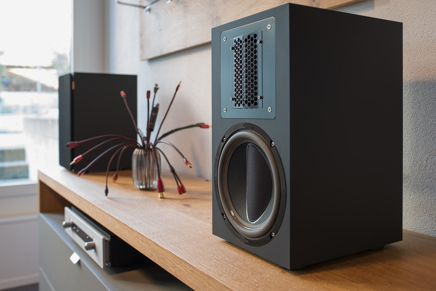 Herausragender Monitor für ins Regal oder aufs Sideboard. Perfekt wandnahe Platzierung dank Acoustic Supension.